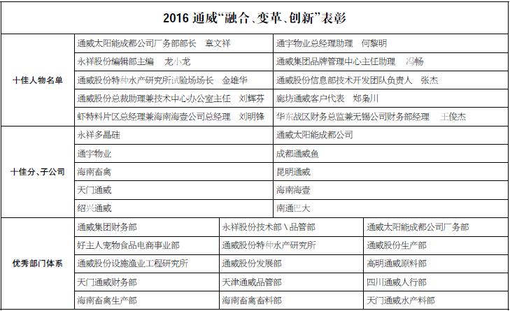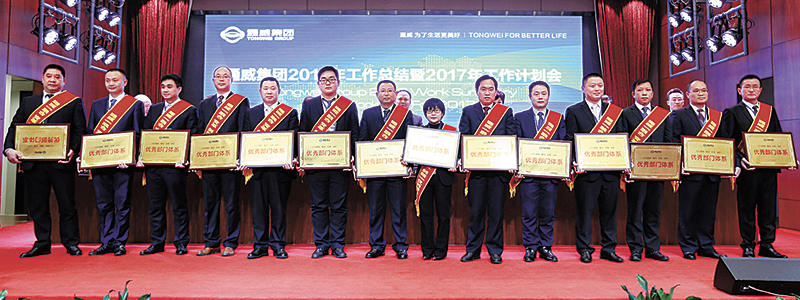 在2016年工作總結暨2017年工作計劃會上,經通威集團總裁辦、通威股份總裁辦及各部門嚴格評選,劉主席最終批示,隆重評選出了符合集團品牌高度、形象定位、管理要求、文化引領的優秀分、子公司、優秀部門體系及先進人物,并授予2016通威“融合、變革、創新”十佳分、子公司、優秀部門體系和十佳人物榮譽稱號,以表彰他們在集團品牌傳播與企業文化建設方面的卓越貢獻。