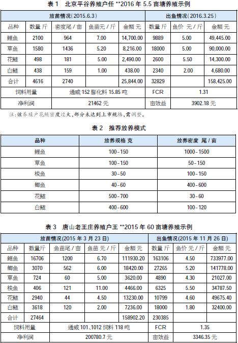 “直出魚”是天津寶坻、武清地區養殖戶習慣叫法,是指每年6-8月放養較小規格魚種,次年6-8月達到上市規格,此時通常魚價相對較高。該模式也采用草、鯉混養或鯉、草、鯽混合放養,吃食魚密度達2000尾/畝,由于飼養周期較長,全程使用中檔次飼料,飼料系數低。