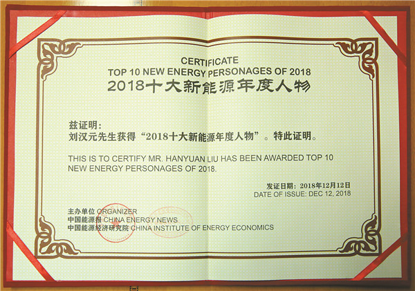 劉漢元主席(右四)榮膺“2018 中國十大新能源年度人物”殊榮