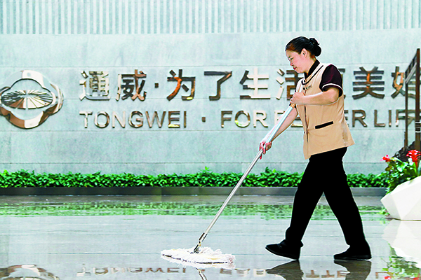 見(jiàn)到李茂群的時(shí)候,她正在位于通威國(guó)際中心4樓的通威集團(tuán)體驗(yàn)中心緊張地忙碌著。“李姐,你們?cè)诖驋呤裁矗俊薄罢箯d正在升級(jí),剛沙了墻,到處都是灰。等下就有人來(lái)參觀,要趕緊把灰塵清理了。你躲開(kāi)點(diǎn),灰大!”她把抹布裹在拖把上,舉過(guò)頭頂,伸進(jìn)鏤空的天花板吊頂,來(lái)回擦拭了不下10遍,然后在水桶里把抹布清洗干凈,換一個(gè)方位,重復(fù)剛才的動(dòng)作。短短20分鐘,反復(fù)做了7、8次,只清理完成了一小塊區(qū)域。