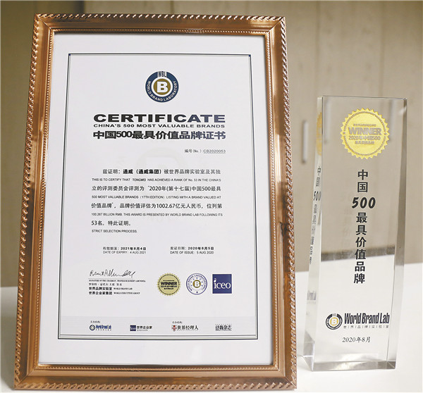 8月5日,由世界品牌實驗室主辦的2020年第十七屆世界品牌大會在北京舉行。通威品牌價值正式突破1000億元大關(guān),達1002.67億元,創(chuàng)下歷史新高,成為全球水產(chǎn)和光伏兩大行業(yè)首個品牌價值破千億的企業(yè)!通威榮列2020年《中國500最具價值品牌》百強排行榜,位列53位。