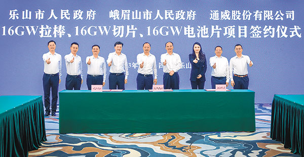 9月28日,通威股份在樂(lè)山投資拉棒、切片、電池片項(xiàng)目簽約儀式成功舉行。樂(lè)山市委書(shū)記馬波,全國(guó)人大代表、全國(guó)工商聯(lián)副主席、通威集團(tuán)董事局劉漢元主席,樂(lè)山市委副書(shū)記陳揚(yáng)杰、副市長(zhǎng)張國(guó)清,通威股份董事長(zhǎng)、CEO劉舒琪出席儀式。通威股份副總裁、永祥股份總經(jīng)理李斌,通威太陽(yáng)能總經(jīng)理周華,五通橋區(qū)委書(shū)記劉勇,區(qū)委副書(shū)記魏陽(yáng)東,峨眉山市委書(shū)記李良,市委副書(shū)記、市長(zhǎng)陳林強(qiáng)等領(lǐng)導(dǎo)參加。