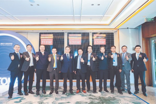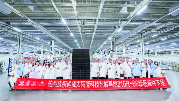 在重磅嘉賓、參會媒體的見證下,通威太陽能科技鹽城基地成功下線首件TNC-G12R-66版型組件。這是繼南通基地TNC-G12R-48版型組件下線后,通威正式實現了TNC-G12R大矩形組件的全面供應。