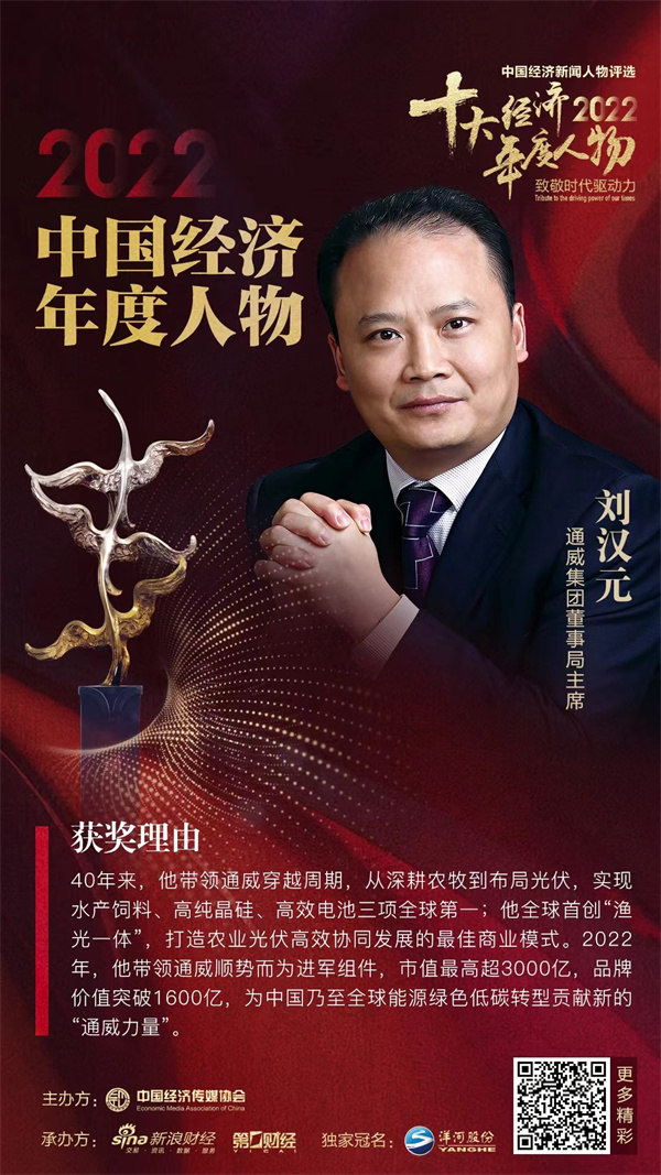 1月6日,被譽為中國經(jīng)濟奧斯卡大獎的“中國夢杯?中國經(jīng)濟新聞人物——2022十大經(jīng)濟年度人物”頒獎盛典在北京舉辦。全國人大代表、全國工商聯(lián)副主席、通威集團董事局劉漢元主席榮膺“2022中國經(jīng)濟年度人物”。全國工商聯(lián)原副主席、農(nóng)業(yè)農(nóng)村部原副部長齊景發(fā),英才元投資董事長宋立新為劉漢元主席頒獎。