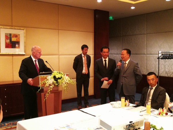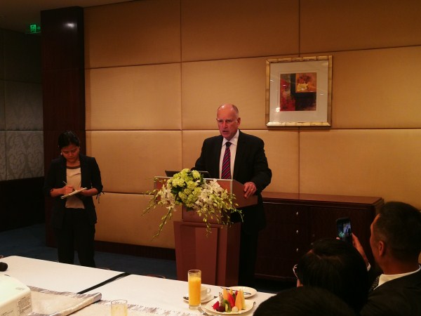6月4日上午,美國加利福尼亞州杰瑞·布朗州長早餐歡迎會在成都香格里拉酒店舉行。加州州長杰瑞·布朗,加州空氣資源委員會主席瑪麗·尼克爾斯,加州對外事務(wù)辦公室主任吉米·卡拉翰,加州州長辦公室中國事務(wù)特別顧問戴凡,美國駐成都總領(lǐng)事谷立言,十一屆全國政協(xié)常委、通威集團(tuán)董事局劉漢元主席,瀘州市市長劉強(qiáng),四川省外僑辦美大處處長苗榮華及部分企業(yè)代表出席歡迎會。劉漢元主席作為全場唯一代表,與布朗州長進(jìn)行了親切友好的對話。