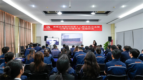 本次活動(dòng)以全體參會(huì)人員起立,齊唱《通威之歌》拉開(kāi)序幕。隨后集體觀看訂單交付主題VCR,短片從供應(yīng)端、制造端到客戶端全面呈現(xiàn)通威太陽(yáng)能科技公司各環(huán)節(jié)的高效協(xié)同能力。隨后,計(jì)劃運(yùn)營(yíng)管理部對(duì)2024年“訂單交付提升”工作進(jìn)行宣貫,分享訂單交付提升月的活動(dòng)內(nèi)容與成果,闡釋年度交付目標(biāo)達(dá)成解析與挑戰(zhàn)認(rèn)知。