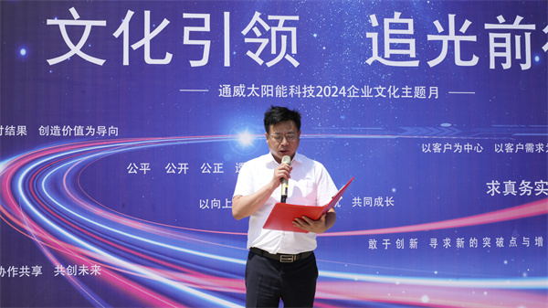 領(lǐng)導(dǎo)致辭環(huán)節(jié),蕭總指出,企業(yè)文化的建設(shè)和傳承需要全體員工的共同參與,用大家的言行舉止詮釋文化,用自身的責任和擔當傳遞文化,不斷為通威太陽能科技有限公司的企業(yè)文化注入生機和活力。五月作為我們的企業(yè)文化主題月,希望大家能夠以此為契機,主動學(xué)習文化理念、積極參與各類文化活動,干部群體更要以身作則,發(fā)揮模范帶頭作用,全員爭做企業(yè)文化的踐行者與推廣者,共創(chuàng)更具通威太陽能科技個性與特色的組織文化氛圍。