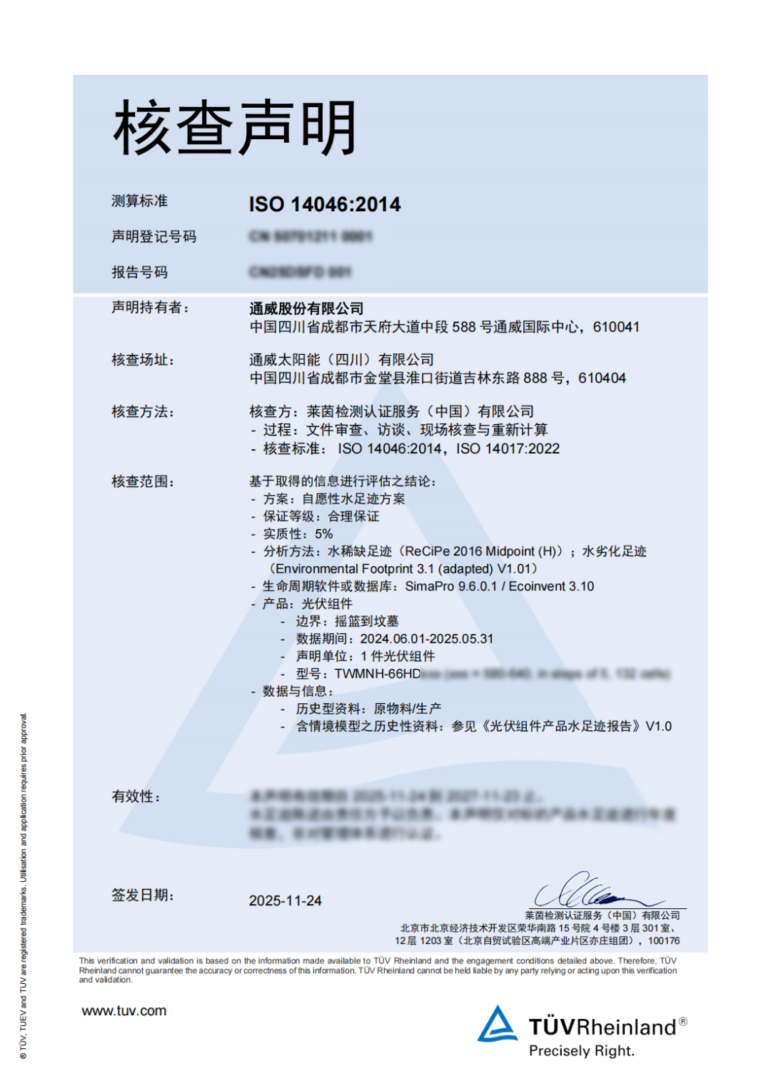 行業(yè)首例!通威三大組件基地獲TÜV萊茵產(chǎn)品水足跡核查聲明,全面賦能產(chǎn)品可持續(xù)屬性