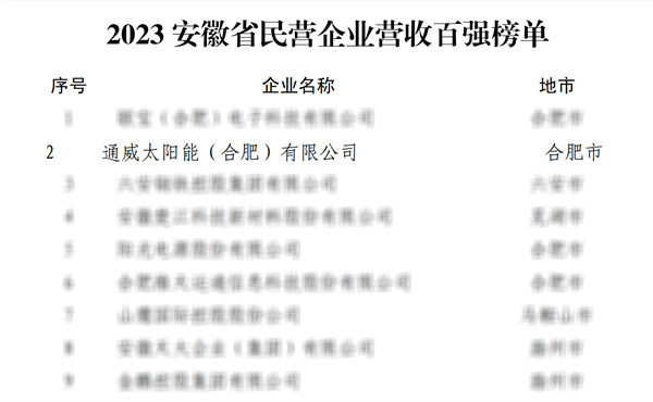 通威太陽能(合肥)有限公司榮登2023年度安徽省民營企業(yè)雙百強榜單
