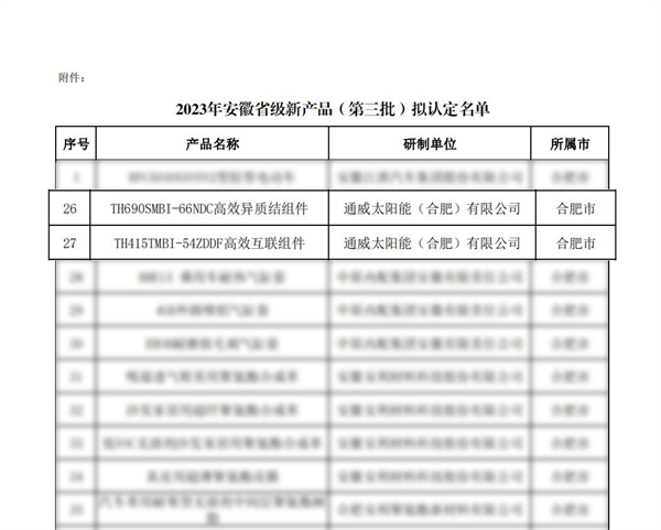 通威太陽能(合肥)有限公司兩項產(chǎn)品榮獲安徽省新產(chǎn)品稱號