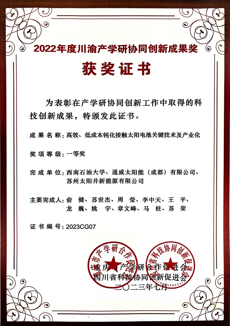 通威太陽能榮獲“2022年度川渝產學研協同創新成果獎”一等獎