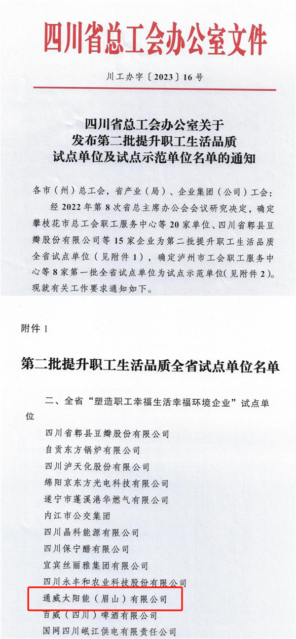 通威太陽能眉山基地獲評四川省“塑造職工幸福生活幸福環境企業”試點單位