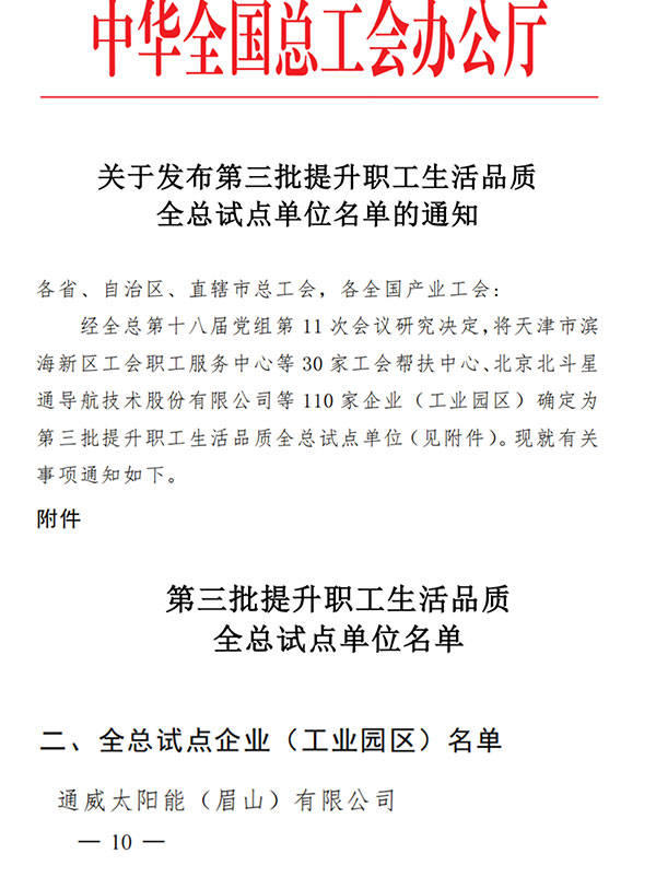 近日,全國總工會發(fā)布了“塑造職工幸福生活幸福環(huán)境企業(yè)”試點單位名單,通威太陽能眉山基地成功入選該項試點名單。