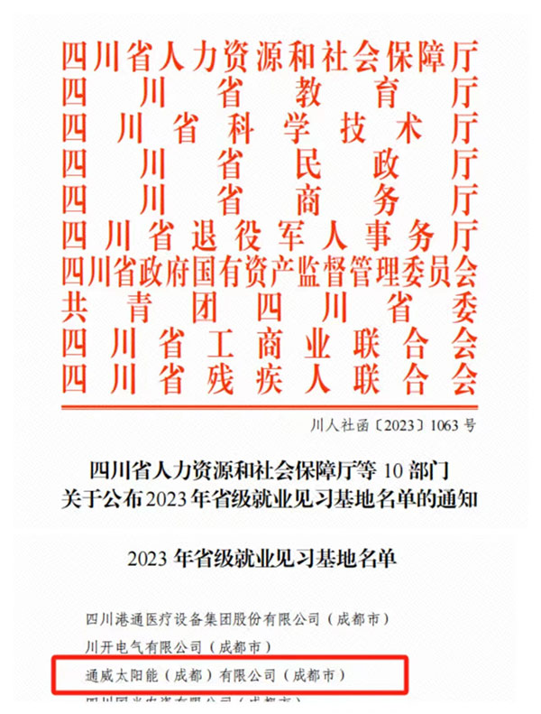 12月26日,四川省人社廳、教育廳、科學(xué)技術(shù)廳等10個省級部門聯(lián)合發(fā)文,公布了2023年省級就業(yè)見習(xí)基地名單,通威太陽能雙流基地獲評“2023年省級就業(yè)見習(xí)基地”。