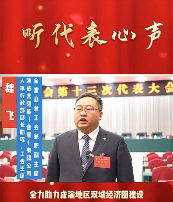 會中,魏飛接受采訪表示,作為光伏產(chǎn)業(yè)一線工人代表參會并當選,深感責任重大,接下來將堅定信心、立足崗位,著力服務中心、服務大局,把個人和企業(yè)的成長融入到金堂縣高質(zhì)量發(fā)展的大局中,貢獻通威工人力量。