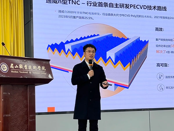 授課現(xiàn)場(chǎng),姚騫總團(tuán)隊(duì)以《通威TNC電池技術(shù)與優(yōu)勢(shì)分析》為題,圍繞太陽(yáng)能電池技術(shù)展開(kāi)分享,深入淺出地講解了科技創(chuàng)新的魅力和通威N型TNC電池技術(shù)的先進(jìn)性,闡述了每一次原創(chuàng)技術(shù)的產(chǎn)生都是經(jīng)過(guò)數(shù)不清的實(shí)驗(yàn)測(cè)試。堅(jiān)持不懈的科技工作者精神是每一位科技工作者應(yīng)具備的基本素養(yǎng)。姚騫總鼓勵(lì)同學(xué)們一定要認(rèn)真學(xué)習(xí),打好學(xué)習(xí)基礎(chǔ),不斷進(jìn)步,希望通過(guò)授課可以培養(yǎng)同學(xué)們科技創(chuàng)新的信念,將來(lái)為家鄉(xiāng)建設(shè)添磚加瓦。