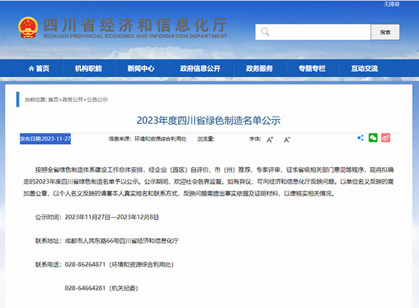 11月27日,四川省經濟和信息化廳發布了《2023年度四川省綠色制造名單公示》(公示期截至12月8日),通威太陽能金堂公司成功入選2023年度“四川省綠色工廠”,這是繼雙流、眉山基地之后,公司榮獲的又一綠色制造體系榮譽。