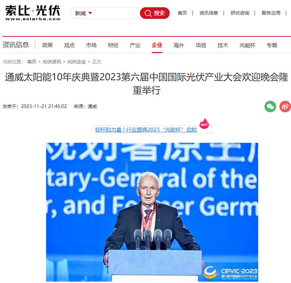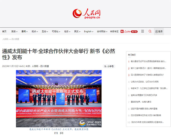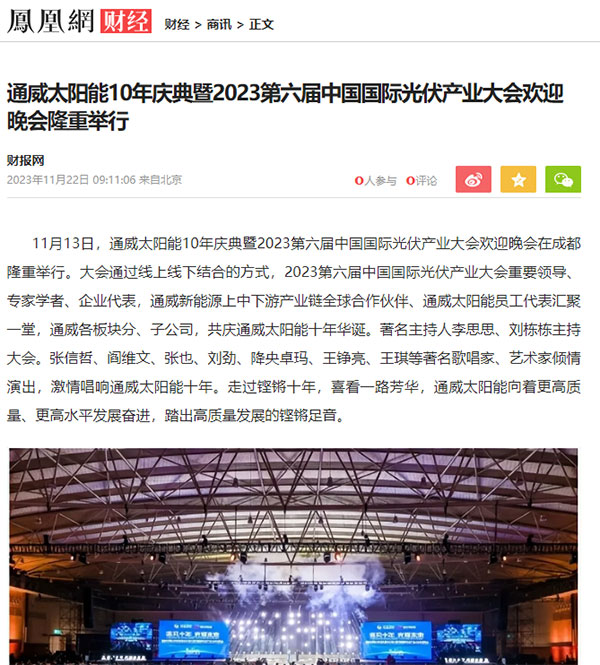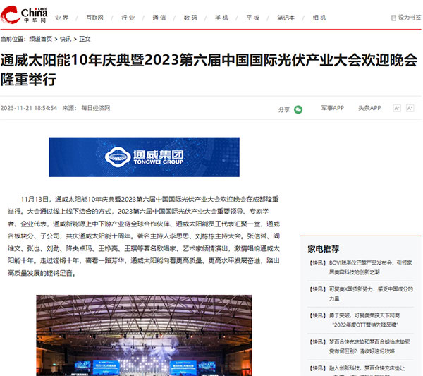 人民網、中華網分別聚焦通威太陽能十年·全球合作伙伴大會和通威太陽能10年慶典暨2023第六屆中國國際光伏產業(yè)大會歡迎晚會,報道了通威太陽能十年新書《必然性》的發(fā)布及慶典晚會的舉辦。同時,鳳凰網、和訊網、紅商網、索比光伏網等財經和光伏行業(yè)媒體也爭相報道通威太陽能十年盛典事宜,彰顯了通威太陽能強勁的發(fā)展實力和行業(yè)影響力。