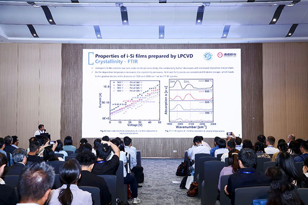 孟夏杰部長作題為《Effective boron doping of LPCVD deposited intrinsic silicon》(LPCVD技術沉積本征硅的有效硼摻雜)專題演講,分享了通威對硼摻雜多晶硅的技術研究,使用BCl3對本征非晶硅進行摻雜,通過控制沉積溫度和退火有效控制多晶硅晶粒有效硼摻雜,硼擴散后的p+多晶硅表現(xiàn)出良好的鈍化性能和低的接觸電阻,以此技術應用可推進TBC電池技術研發(fā)。目前通威在TBC技術研發(fā)已具備完善的研究中心及試驗線,TBC研發(fā)效率p型達到了25.41%,n型達到26.5%,遠超行業(yè)平均水平。