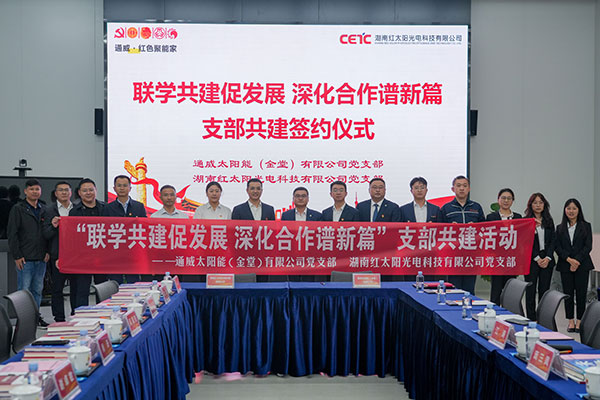 以黨建促發(fā)展、以共建話交流。通過本次支部共建活動,雙方再度加強合作深度,探索公司黨組織之間優(yōu)勢互補、資源共享、共同發(fā)展的黨建新思路,助力黨的政治優(yōu)勢、組織優(yōu)勢轉化為公司的發(fā)展優(yōu)勢、競爭優(yōu)勢。未來,通威太陽能金堂基地黨支部將持續(xù)與新能源綠色產業(yè)鏈相關企業(yè)保持交流合作,發(fā)揮企業(yè)優(yōu)勢,攜手為綠色新能源產業(yè)發(fā)展凝聚強大動力,共同書寫全球光伏產業(yè)新篇章。