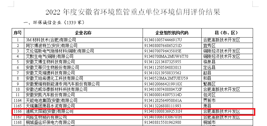 近期,安徽省生態環境廳發布了關于2022年度安徽省環境監管重點單位環境信用評價結果的公告,通威太陽能安徽公司榮列“2022年安徽省環保誠信企業”榜單。
