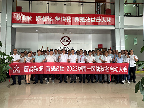 2023年9月14日,華南一區戰秋冬啟動大會在廣東通威順利召開,通威農發副總經理何東鍵、華南一區總經理巫勝東、廣東通威總經理趙玉東、成都生物水產營銷總經理梁海及華南一區各營銷公司總經理、市場經理及服務經理,共40余人出席會議。
