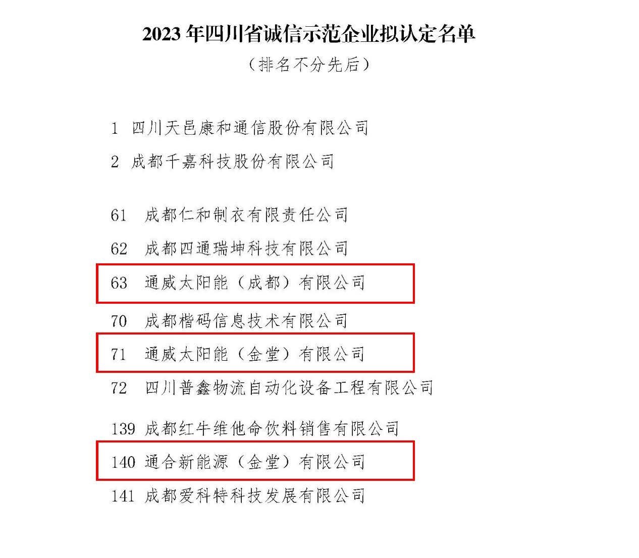 通威太陽能成都、金堂、通合公司榮獲2023年四川省誠信示范企業