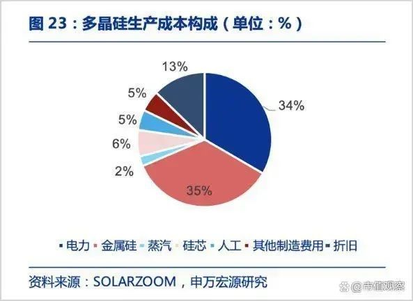 拆解硅料生產(chǎn)成本,電力、金屬硅、蒸汽、硅芯、人工、其他制造費用、折舊占比分別為34%、35%、2%、6%、5%、5%、13%。其中,電力、硅粉和折舊占比最高。