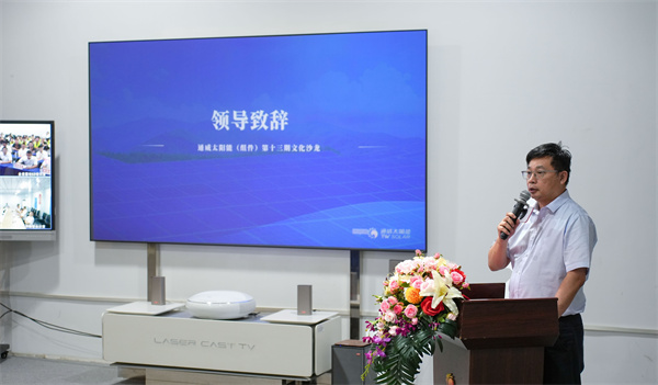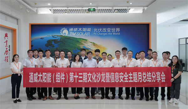 8月31日,通威太陽能(組件)人事行政部組織開展了第十三期文化沙龍暨信息安全主題月總結分享會活動。通威股份總裁助理、通威太陽能(合肥)有限公司總經理蕭圣義,通威太陽能(鹽城)有限公司副總經理翟緒錦,通威太陽能(四川)有限公司組件一廠廠長朱劍誠攜各基地部門負責人及員工代表共計200余人參加活動。