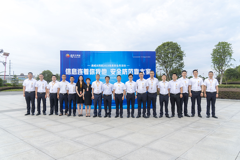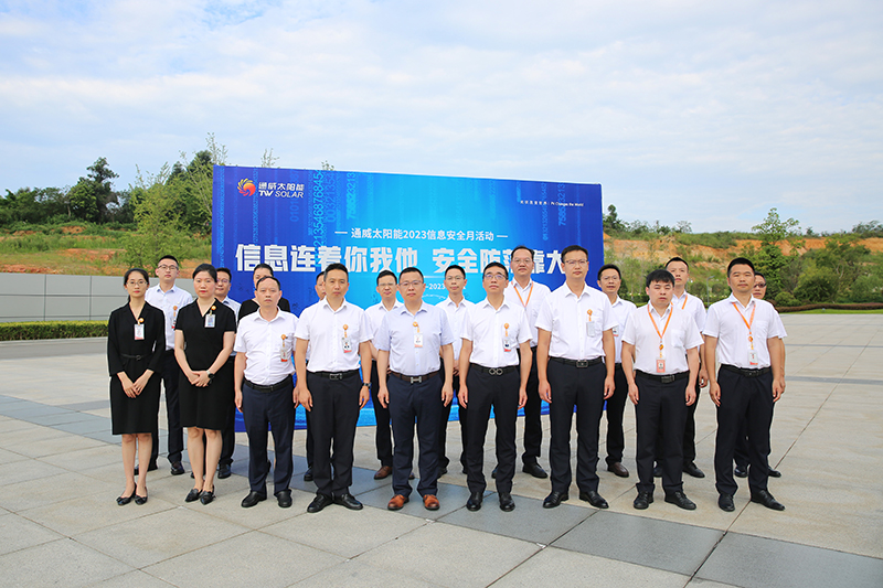 為應對當前日益復雜的信息安全形勢,進一步普及信息安全知識,加強公司全員信息安全意識,激發信息安全主人翁意識。7月31日,通威太陽能安徽公司、雙流基地、眉山基地、金堂基地、通合項目及彭山基地同步舉行第三屆信息安全月啟動儀式。通威太陽能總經理周華、副總經理宋梟、總經理助理陳君及各基地中高管團隊出席本次啟動儀式。啟動儀式現場,各地中高管團隊在主題墻上簽名及合影留念,正式啟動通威太陽能第三屆信息安全月。