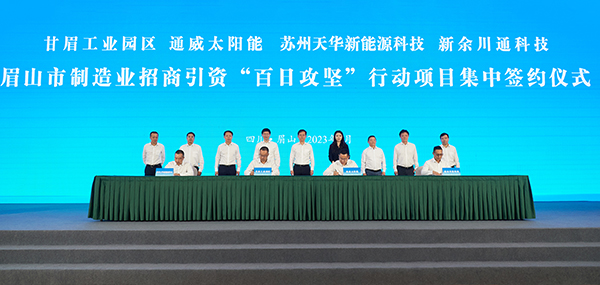 7月10日,眉山市制造業(yè)招商引資“百日攻堅(jiān)”行動(dòng)項(xiàng)目集中簽約儀式舉行。眉山市委書記胡元坤,市委副書記、市政府市長(zhǎng)黃河,市委常委、市政府常務(wù)副市長(zhǎng)孫劍,市委常委、統(tǒng)戰(zhàn)部部長(zhǎng)魯力,市政府副市長(zhǎng)鄒汝林和市政府相關(guān)部門負(fù)責(zé)人出席會(huì)議。眉山天府新區(qū)、各縣(區(qū))相關(guān)工作負(fù)責(zé)人,甘眉工業(yè)園區(qū)黨工委、管委會(huì)班子成員及相關(guān)部門負(fù)責(zé)人參加會(huì)議。通威股份董事長(zhǎng)、CEO劉舒琪,通威太陽(yáng)能總經(jīng)理周華,副總經(jīng)理宋梟作為簽約企業(yè)代表受邀出席,并與甘眉工業(yè)園區(qū)正式簽署了《通威太陽(yáng)能有限公司16GW高效晶硅電池項(xiàng)目投資協(xié)議書》。