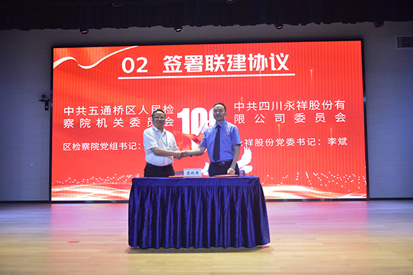 為深入探索檢企黨建聯(lián)建新思路、新模式,搭建黨建交流新平臺(tái),推動(dòng)黨建工作與檢察業(yè)務(wù)工作、企業(yè)生產(chǎn)經(jīng)營深度融合,助力營造優(yōu)質(zhì)法治營商環(huán)境,推動(dòng)五通橋經(jīng)濟(jì)社會(huì)高質(zhì)量發(fā)展,7月7日,中共五通橋區(qū)人民檢察院機(jī)關(guān)黨委、中共四川永祥股份有限公司黨委“檢企聯(lián)建聚合力 黨建引領(lǐng)促發(fā)展”黨建聯(lián)建活動(dòng)順利舉行。五通橋區(qū)檢察院黨組書記、檢察長蘇登科,區(qū)檢察院黨組成員、副檢察長楊科,永祥股份黨委書記、總經(jīng)理李斌,永祥股份黨委副書記、永祥新能源黨支部副書記、永祥股份副總經(jīng)理羅周出席,五通橋區(qū)檢察院、永祥股份黨員同志參加。