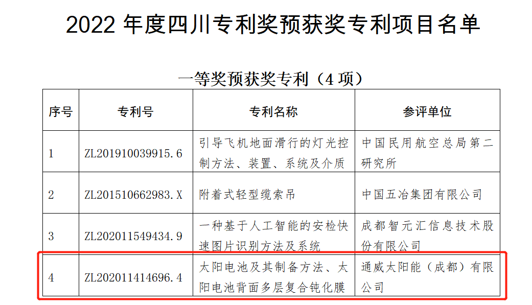 四川省知識產權服務促進中心在2023年6月27日公布了《2022年度四川專利獎評審結果的公示》(公示期為七工作日),擬對在2022年度申報的優秀專利獎項目進行推薦及表揚,光伏技術部代表通威太陽能參與該專利獎的申報、評審及答辯工作,通威太陽能憑借在技術研發創新和知識產權保護的突出表現成功獲得四川省專利獎項目一等獎的榮譽。