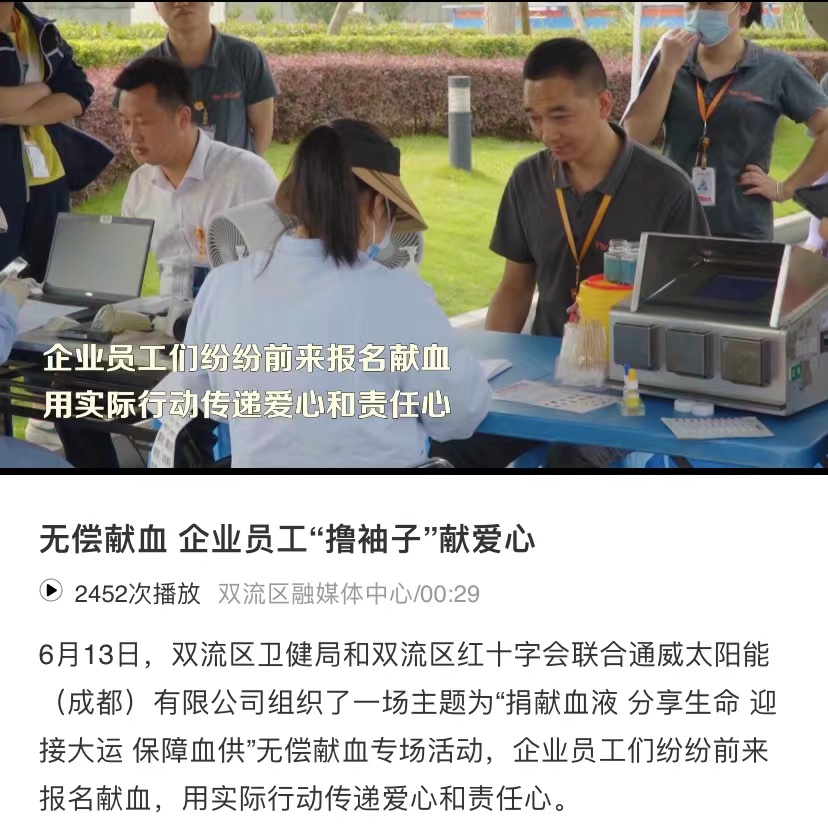 6月13日及14日,四川新聞網(wǎng)和雙流發(fā)布分別以《通威太陽(yáng)能(眉山)有限公司:滾燙熱血 是生命的接力》《無(wú)償獻(xiàn)血:企業(yè)員工“擼袖子”獻(xiàn)愛(ài)心》為題,聚焦通威太陽(yáng)能職工積極參與愛(ài)心獻(xiàn)血公益活動(dòng)。