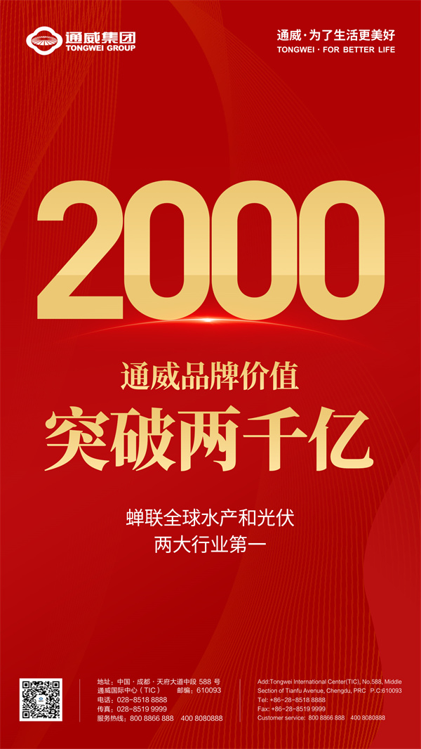 6月15日下午,由世界品牌實驗室主辦的(第二十屆)“世界品牌大會”在北京隆重舉行。大會發布了2023年《中國500最具價值品牌》榜單。通威品牌價值再創歷史新高,達到2013.76億元,排名從去年的第50位上升至42位,繼續蟬聯全球水產和光伏兩大行業第一。通威連續20年榮列這一國際公信力和認同度最高、權威性和參鑒性最強的中國品牌國家隊,不斷刷新歷史紀錄,讓世界看見中國光伏品牌力量。