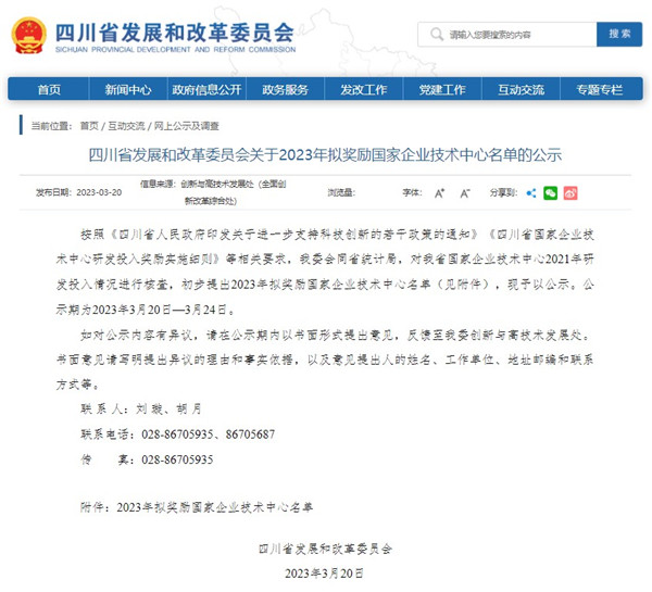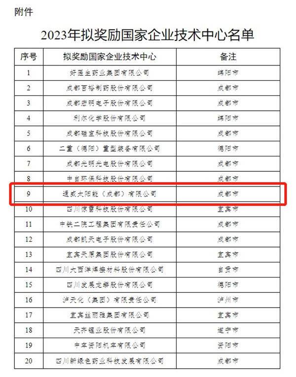 3月20日,四川省發改委公示了2023年擬獎勵國家企業技術中心名單,通威太陽能雙流基地國家企業技術中心榮列其中。