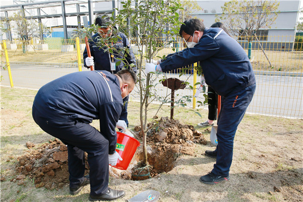 植樹活動現場,大家四人一組,分工明確,默契配合,干勁十足。從樹苗選取到現場刨坑,再到扶苗入坑,培土澆水,最后取名掛牌,一系列動作一氣呵成。陽光下,綠色的樹苗和藍色的工裝交錯相映,空氣中彌漫著泥土的芳香,一片生機盎然的春日景象。在3月暖陽的照耀下,在歡聲笑語的環繞中,一群人播種綠色,收獲春天。
