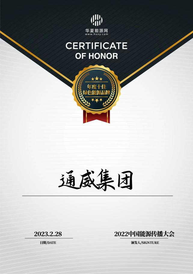 2022年,能源行業與全球政治經濟同頻共振,度過了不平凡的一年。在這樣一個充滿變革的年代、在這場“追風逐日”的競賽中,媒體與企業互生共進、緊密合作,共同講好中國故事和中國能源轉型故事,為雙碳目標落地貢獻著力量。本屆大會特別設置“2022年度十大綠色能源品牌”評選,從低碳生產、綠色供應、行業影響力、品牌美譽度等維度,評選出在綠色、環保方面作出突出貢獻的品牌企業。獲此殊榮,是對通威在綠色能源產業長久以來持續創新研發、深耕品牌價值的高度肯定。