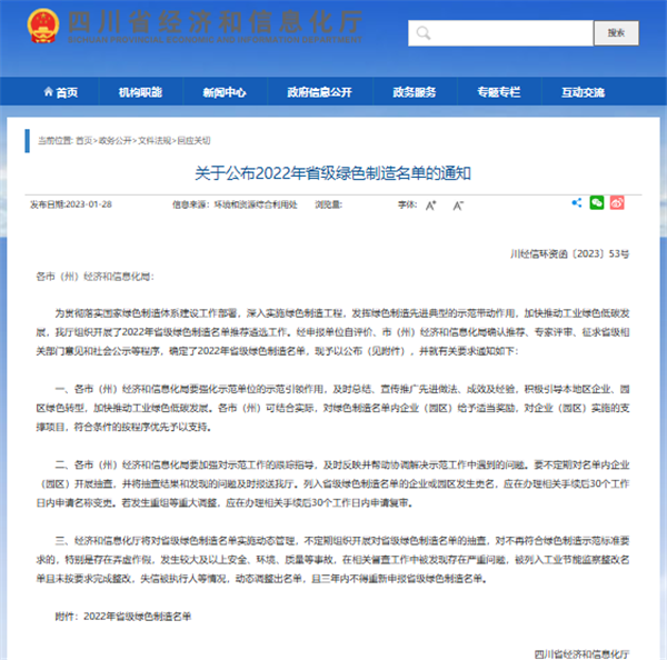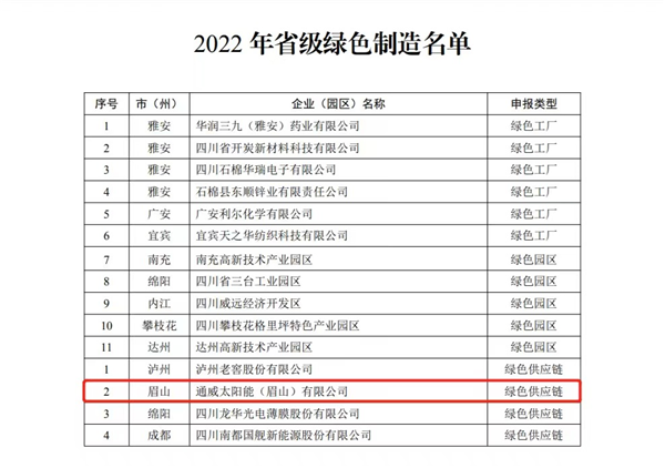 近日,四川省經濟和信息化廳網站正式公布了《2022年省級綠色制造名單》,通威太陽能眉山基地榮列其中,成為此批次眉山唯一一家獲評四川省“綠色供應鏈”管理企業。