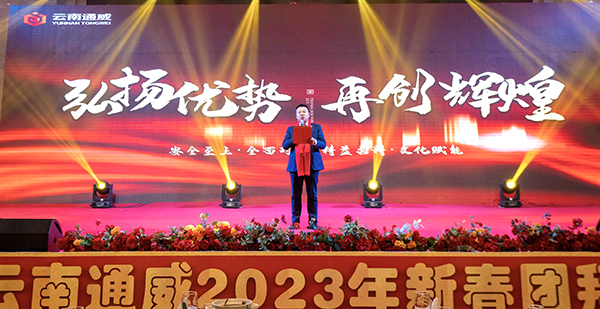 1月13日,云南通威順利舉行“弘揚(yáng)優(yōu)勢(shì),再創(chuàng)輝煌”2023年新春團(tuán)拜會(huì),邀請(qǐng)到保山市人民政府副秘書長(zhǎng)王迪等各職能部門領(lǐng)導(dǎo)列席,云南通威全員參加。