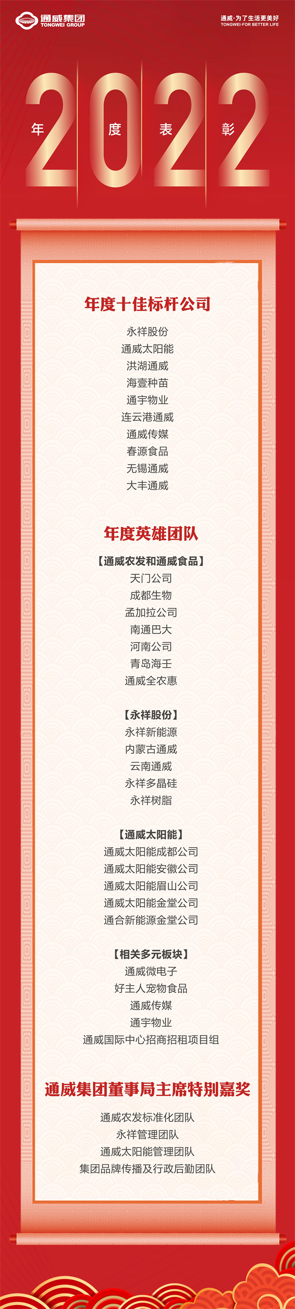 在當天的年度表彰環節中,2022年通威集團“十佳標桿公司”、2022通威年度英雄團隊、通威集團董事局主席特別嘉獎隆重揭曉。