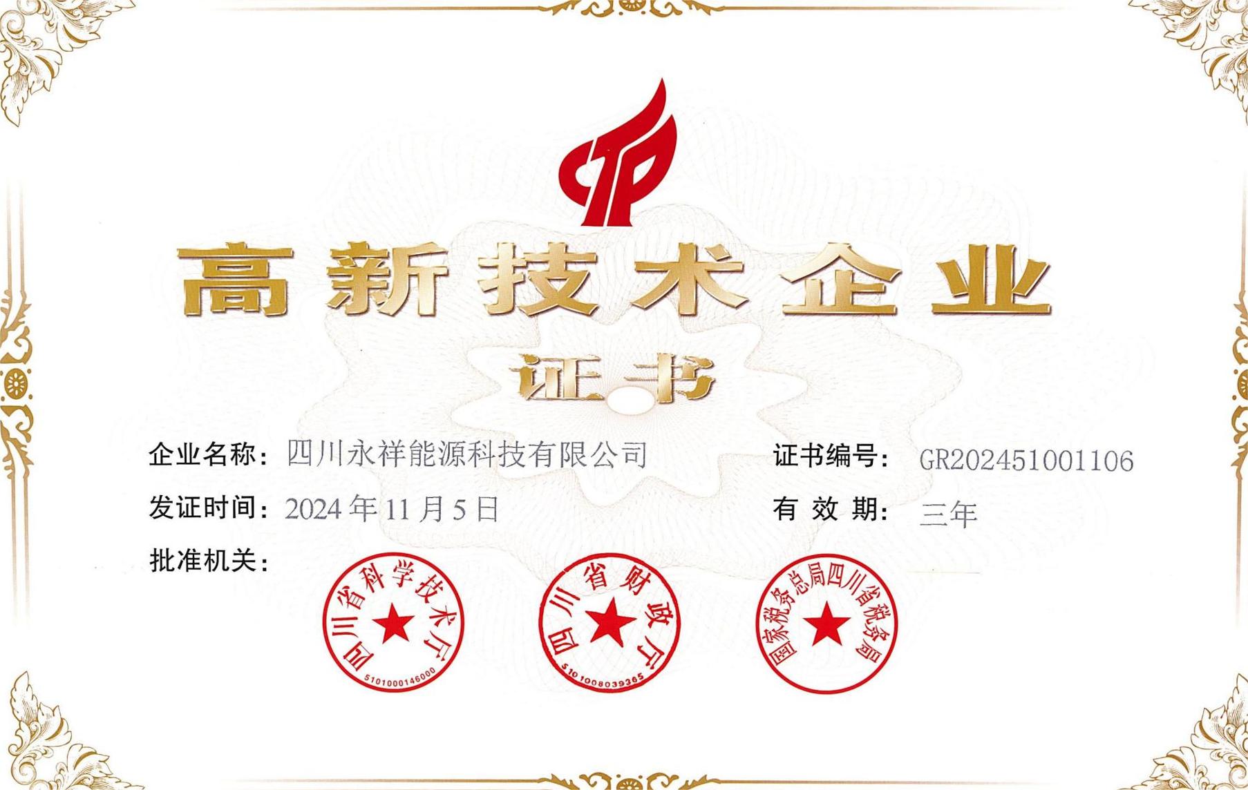 永祥能源科技榮獲“國家高新技術(shù)企業(yè)”榮譽證書