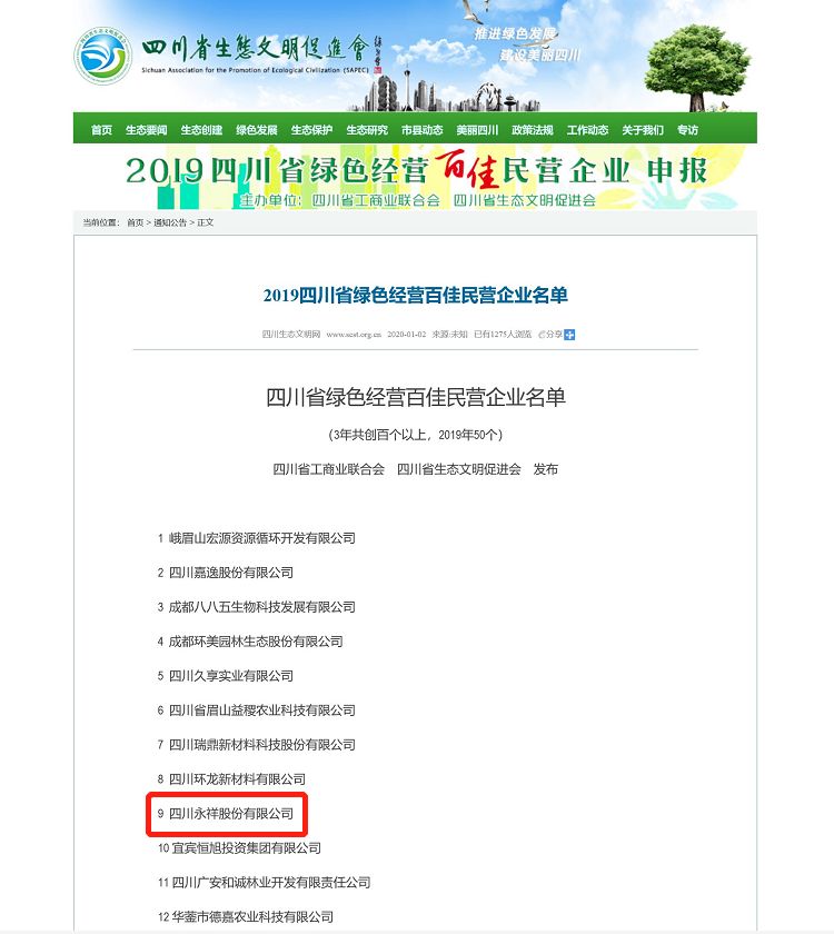 永祥股份榮獲“2019四川省綠色經(jīng)營百佳民營企業(yè)”