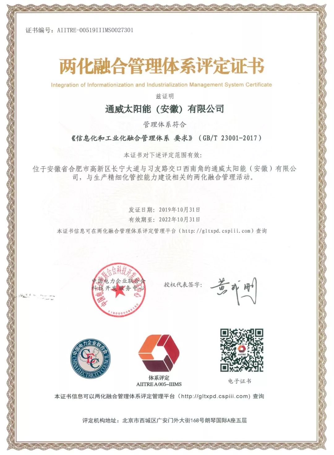 通威太陽能榮獲“兩化融合管理體系評(píng)定證書”