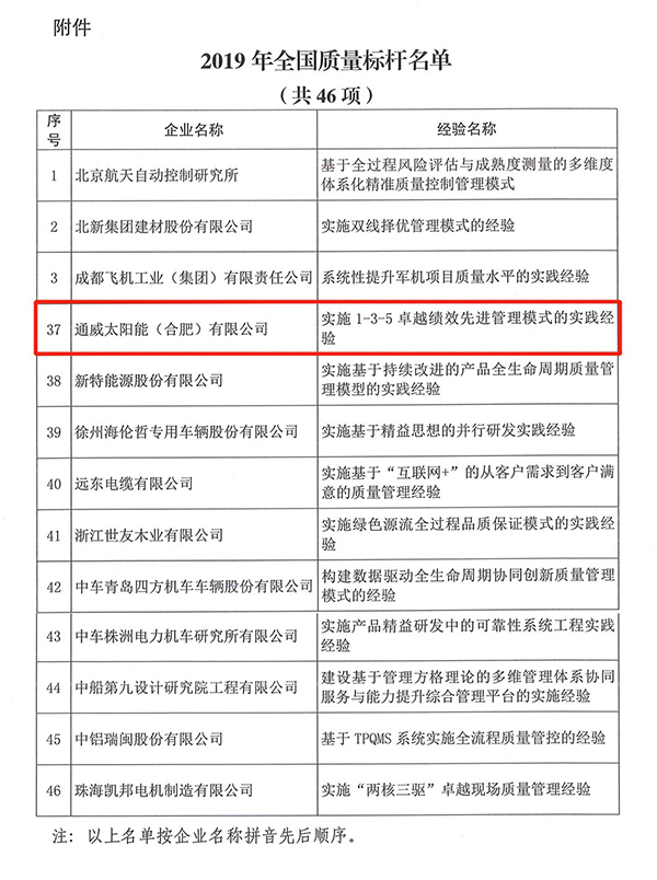 通威太陽能合肥公司榮膺“2019年全國質量標桿”殊榮