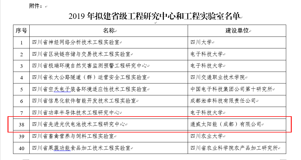 通威太陽能榮列“2019年四川省級工程研究中心”名單