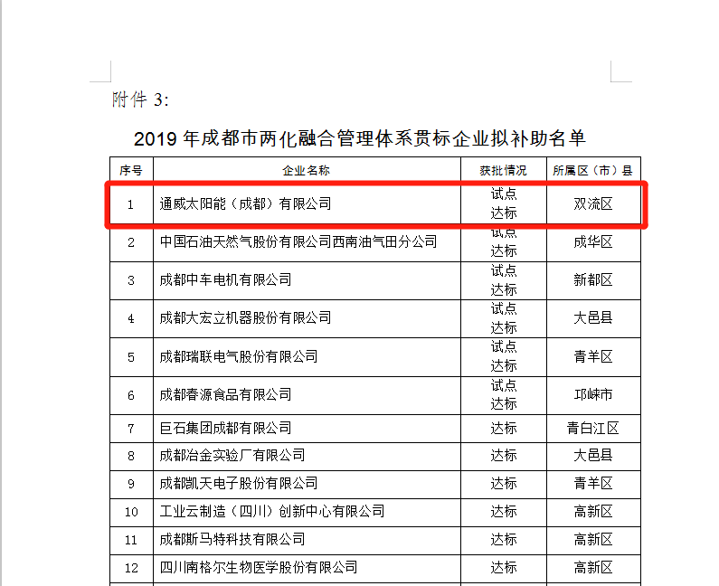 通威太陽能入列2019年成都市兩化融合管理體系貫標企業補助名單