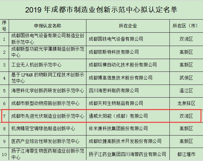 通威太陽能入列2019年成都市制造業創新示范中心擬認定名單