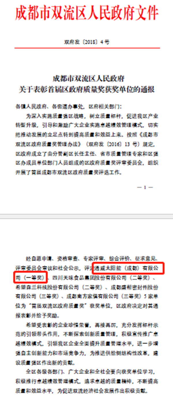 通威太陽能成都公司榮獲首屆雙流區政府質量一等獎