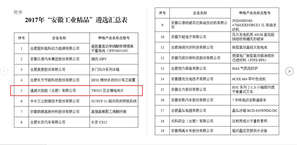 通威太陽能(合肥)有限公司入列2017年“安徽工業精品”公示榜單
